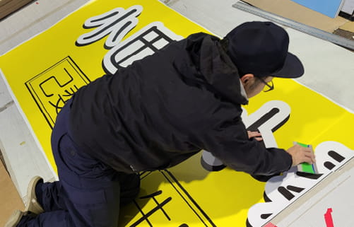 看板のデザイン作成やシートの添付等も自社内で行います。
