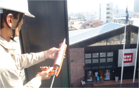 看板の中に水が入らないように、ビス穴等にコーキングを打ちます。