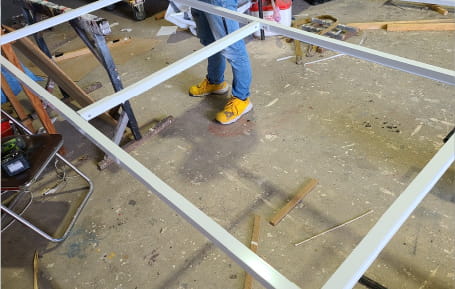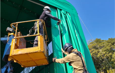 インパクトを使い、テントを固定する作業の様子。安全に十分に配慮して作業を行います。