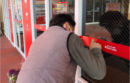 シートをお店のガラスに貼るなどのサインデザインも手掛けています。規模の大小にかかわらず、気を抜かず丁寧に仕上げます。