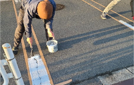 お店の駐車場にラインを入れる様子。白線の塗装等も行っております。